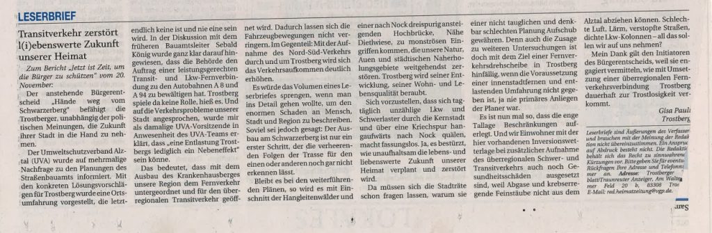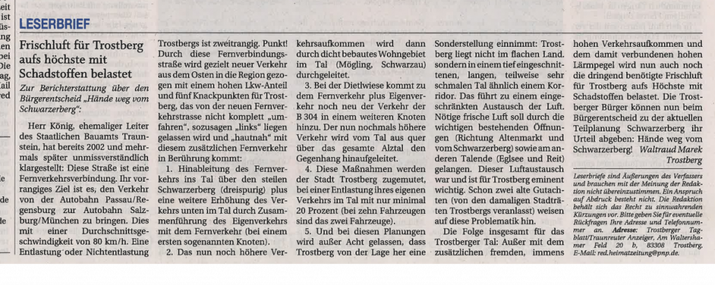Für den Umweltschutzverband ist aufgrund der langjährigen Verkehrsentwicklung nicht erkennbar, welchen Vorteil die Stadt Trostberg bzw. welche Erhöhung unserer Lebensqualität damit einher gehen könnte, in Zukunft an einer ertüchtigten Autobahnverbindung A94 bis A8 zu leben.